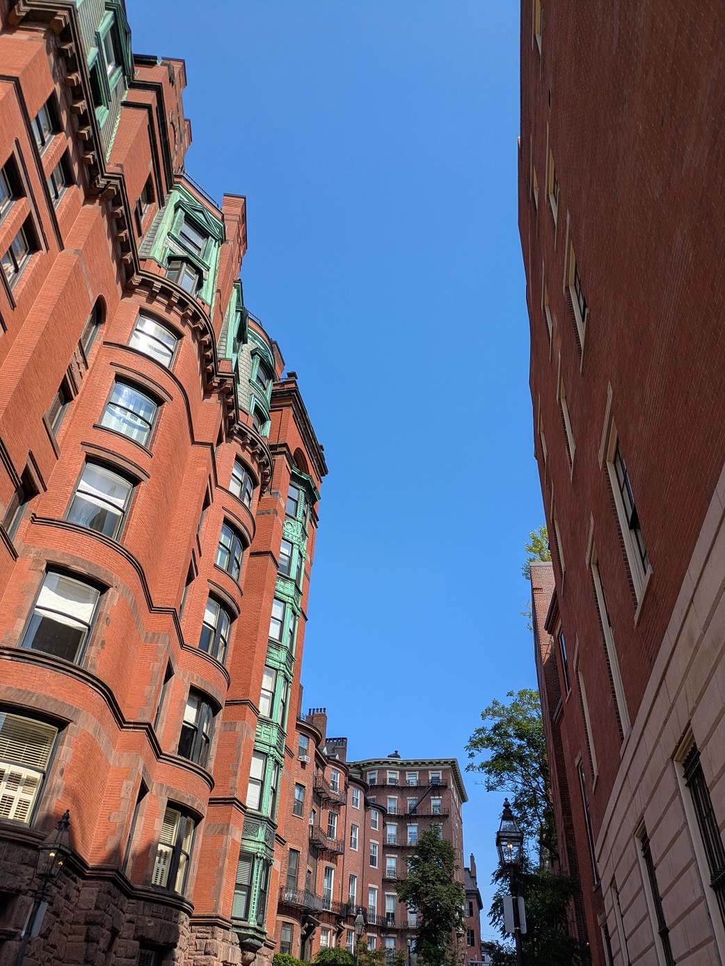 ボストン市内に足を踏み入れると、まず目を引くのは赤レンガ造りの建物たちです。ボストン市内には今もなおレンガ造りの建物が数多く残っておりますが、特にビーコン・ヒルにあるハーディー邸の並びには圧倒されました。レンガ造りの建物たちが道を挟むように建っていて、目の前には広い公園が見え、すぐ近くに金色の屋根の州議事堂があり、美しい自然とボストンの長い歴史、両方が感じられました。