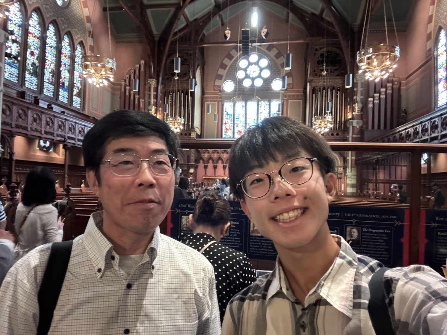 今回、同志社創立150周年の節目に参加させていただきました、同志社香里高校の髙永晃広です。ツアー3日目にはグレイス教会にて勇気の大切さという題材をスピーチしました。スピーチ原稿を考えるにあたり、自分自身の大切にしていることは何なのかということを考える機会がありました。その時に気づいたのは、自分はチャレンジを繰り返すことで、様々な困難に向き合ってきたのだなということです。言葉の壁というのは国を超えコミュニケーションをする際に必ず存在します。しかし、海外生活も通じて感じたことはどのような環境で、どのような育ち方をしたかに関係なく、人類には言葉以外にも通じあえるようになっているということです。表情をはじめ、同じ場所で同じ経験をすると、人は思いを分かち合えることがあります。このことから発展して誰かが頑張ってチャレンジしていると、その「勇気」はポジティブな連鎖につながるのだという思いから、最後は自分自身もチャレンジを続けるという内容で締めさせていただきました。グレイス教会では予想を超える参加者の皆様、現地の教会員の皆様と、自分の本当の想いを共有できたことはこれからの人生の宝物です。自分にとっては新島襄先生の足跡を本井先生のご講演で様々な秘話を教えていただき、辿りながら様々なアメリカの最先端を走る教育施設に訪れることが来たのも素晴らしい経験でした。年齢も近い学生がキャンパスにいるのを見て、世界をこれからリードする人々なんだろうなという思いを馳せると共に、「今」から自分も気持ちを引き締めて頑張ろうと思いました。今回のツアーを企画していただいた本井先生をはじめ、東先生、すべての皆様、ありがとうございました。学校から励ましの言葉と共に送り出してくださった先生方ありがとうございました。最高の思い出ができました!