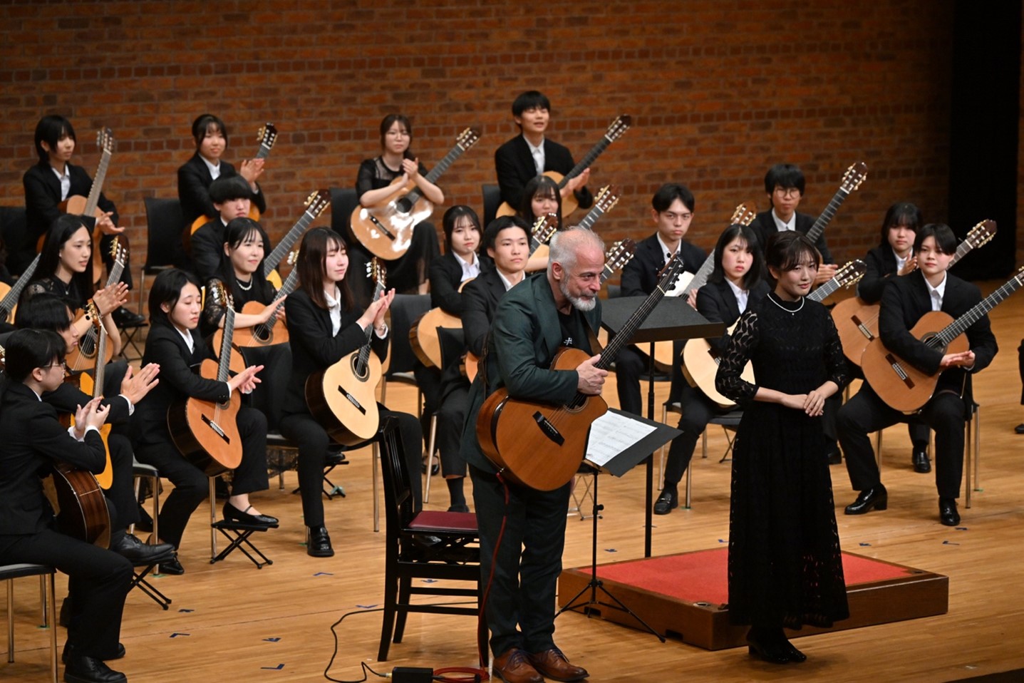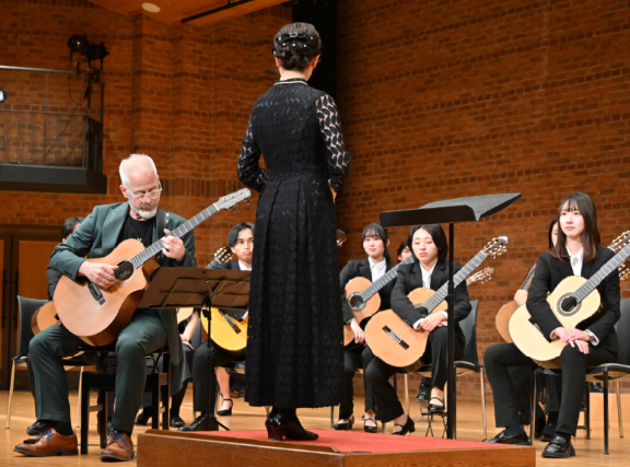 「Doshisha College Song」の協奏は最初にハークネス氏によるソロ編曲演奏に続き、指揮者清水亜美氏編曲協奏がギタークラブ全員とハークネス氏とにより行われて締めくくられました。初めての「Doshisha College Song」のアコースティックギターとクラッシックギターの協奏に会場から盛大な拍手が沸き起こりました。